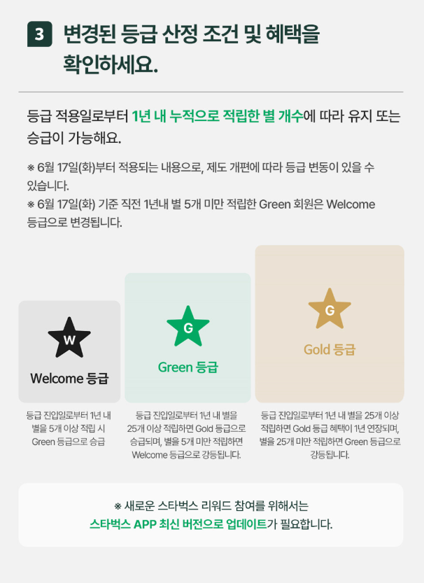 스타벅스의 리워드 프로그램은 기존과 동일하게 웰컴(Welcome), 그린(Green), 골드(Gold) 세 가지 등급으로 운영됩니다. 등급 전환 기준도 변경되지 않았으며, 다음과 같습니다.